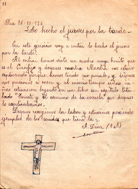 La siguiente página corresponde al 23 de octubre de 1936 (Figura 4), bajo el título "La reconquista de la Iglesia y la reposición de los Crucifijos en las escuelas". El título es sugerente, la Iglesia reconquistando su poder. Tuve que leerlo dos veces, empaparme de lo que decía. Me costaba asimilarlo, a pesar de lo que sabemos sobre la dictadura franquista y la guerra civil. Era tan brutal el cambio al pasar de una hoja del cuaderno a otra. A mi madre con 9 años se le hablaba y se la hacía escribir con desprecio sobre los “rojos”. ¡La diferencia es clara! No había encontrado en las hojas anteriores ni una sola referencia al golpe militar, salvo que había que proteger a los niños en época de guerra. Y después del desprecio hacia los rojos, vienen los “buenos” que iban todos juntos a misa, reponían los crucifijos en las escuelas (parece que por segunda vez porque ya lo habían hecho anteriormente, justo en la página anterior) y luego desfilaban los falangistas, cantando el “Himno Fascista” (sic), escrito con todas las letras y sin pelos en la lengua.